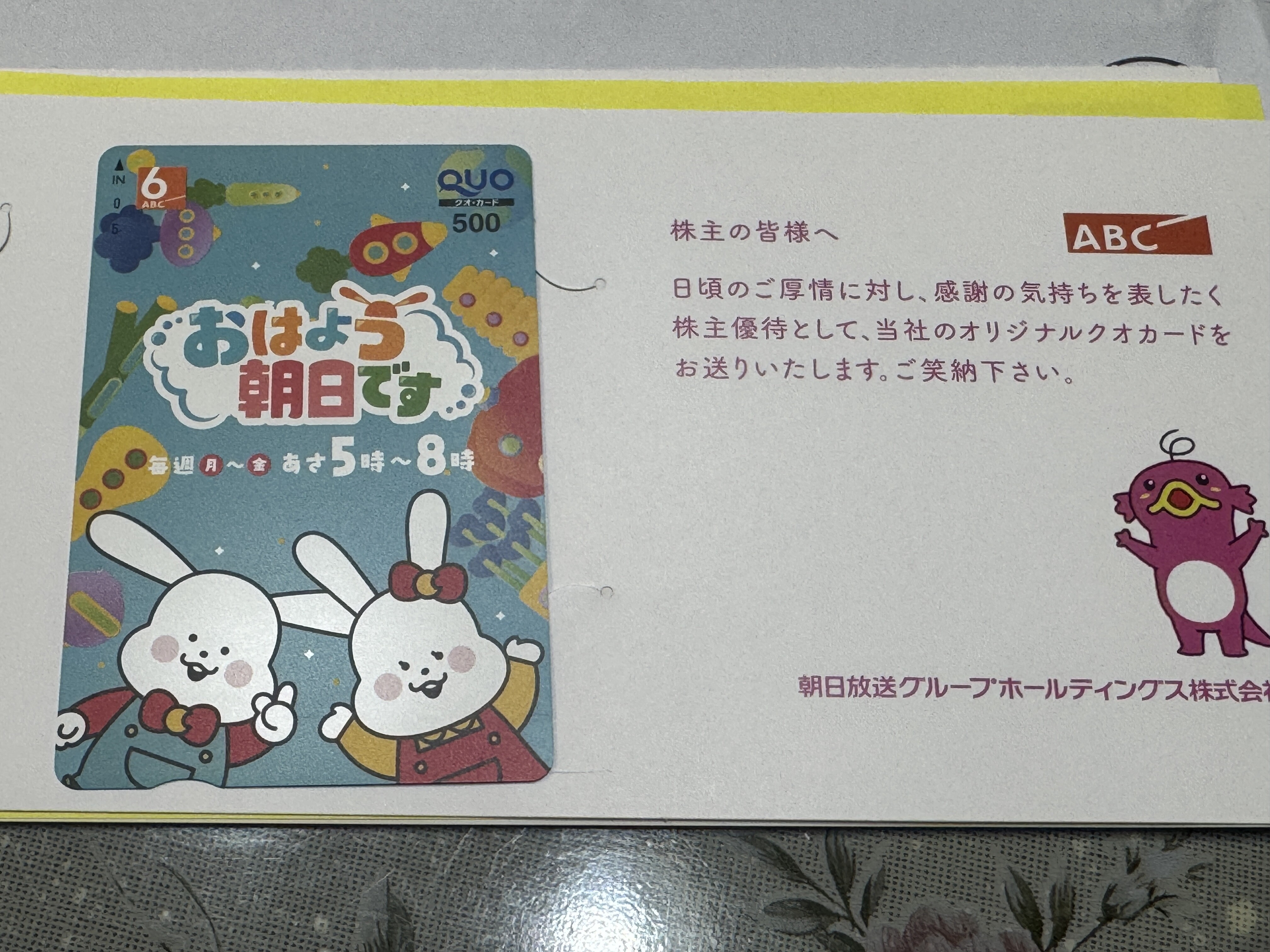 ¥°¥ë¡¼¥×»±²¼¤Î¡ÖABC¥Æ¥ì¥Ó¡ÊÄ«ÆüÊüÁ÷¥Æ¥ì¥Ó¡Ë¡×¤¬À©ºî¤¹¤ëÄ«¤Î¿Íµ¤ÈÖÁȡ֤ª¤Ï¤è¤¦Ä«Æü¤Ç¤¹¡×¤ÎQUO¥«¡¼¥É¤Ç¤·¤¿¡£